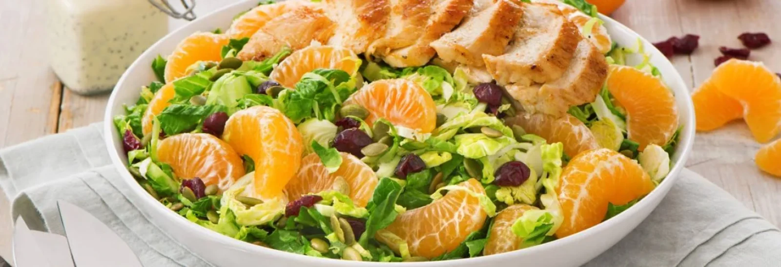 Toss clementine segments, Brussels sprouts, romaine and dried cranberries with dressing. Divide among 4 plates; top with chicken and sprinkle with pumpkin seeds.