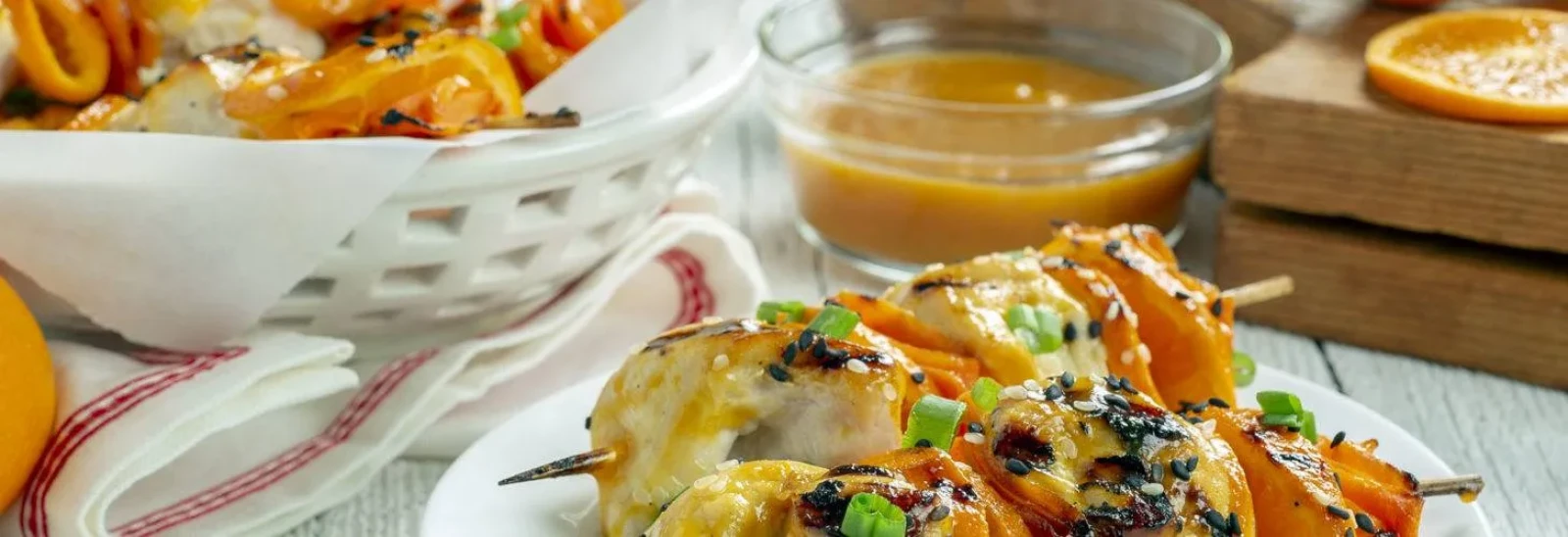 Sprinkle clementine chicken skewers with sesame seeds and sliced scallions before serving.