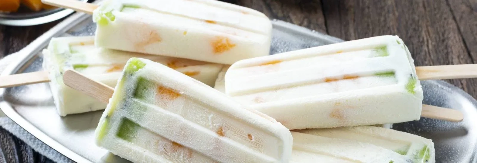 Fill popsicle molds ¾ full with yogurt mixture. Add two kiwi half slices to the sides of each mold with the curved sides pointing down. The flat edges should be even with the top of the molds. Fill the remaining space with the yogurt mixture.