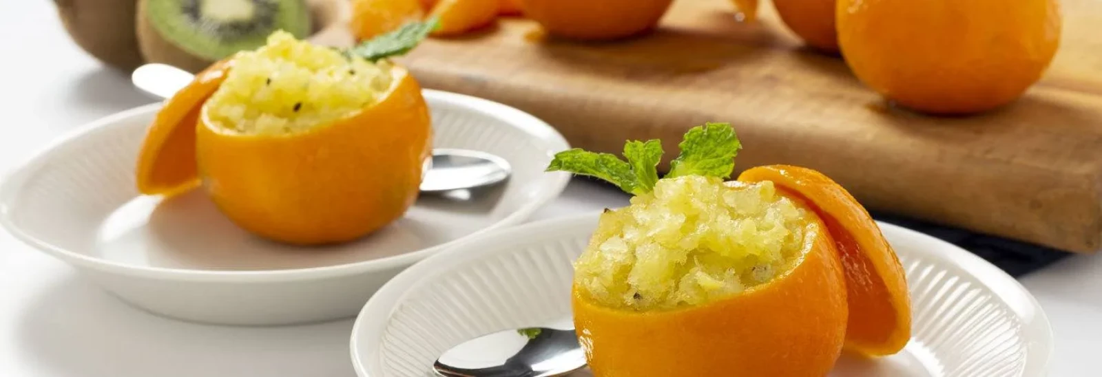 Fill each of the reserved clementine shells with granita. Add the tops and place on a baking sheet in the freezer until ready to serve. Add mint leaves and tops just before serving.
